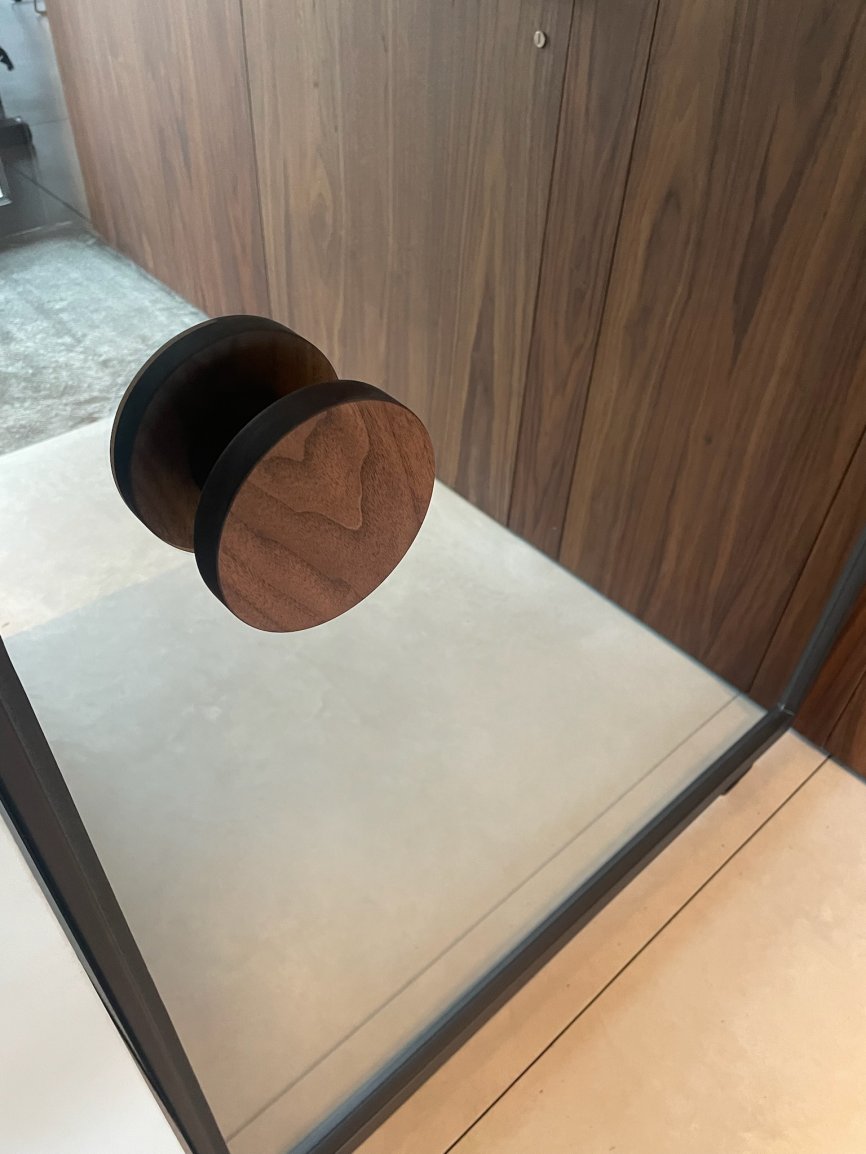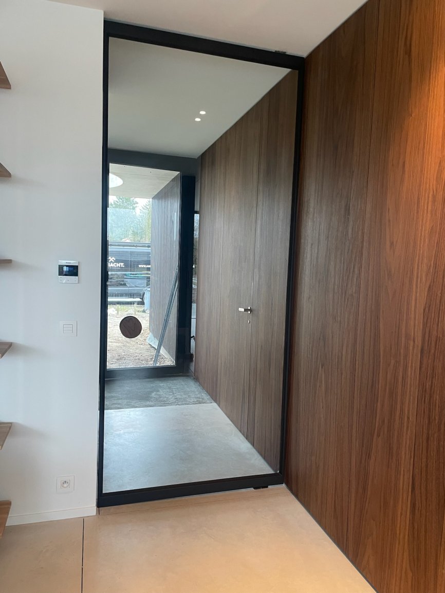 Voor deze klant mochten we een grote pivoterende deur maken zonder onderverdeling maar met een opmaat gemaakte deurgreep. De deurgreep is in hetzelfde hout als de aanliggende kasten.